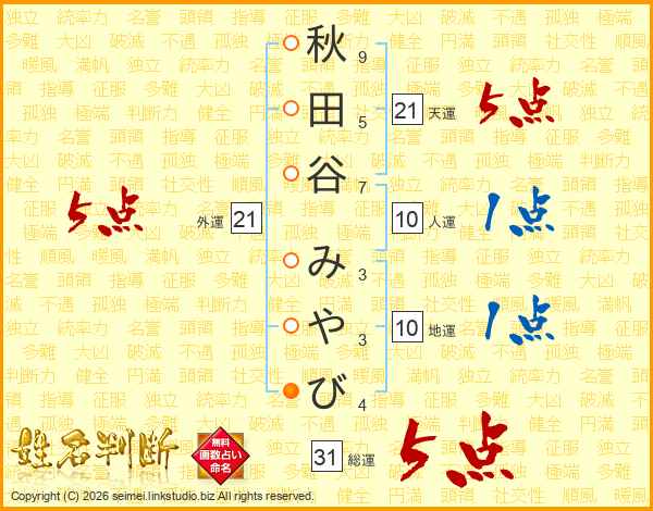 秋(9画)田(5画)谷(7画) み(3画)や(3画)び(4画)