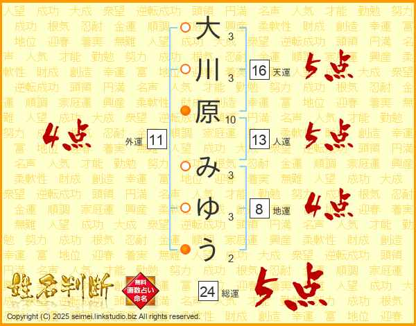 大(3画)川(3画)原(10画) み(3画)ゆ(3画)う(2画)
