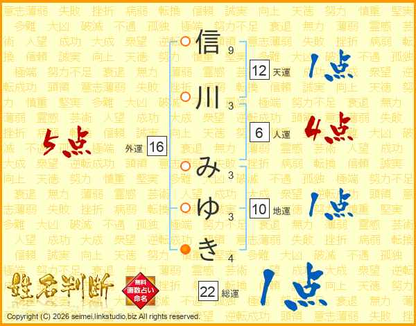 信(9画)川(3画) み(3画)ゆ(3画)き(4画)