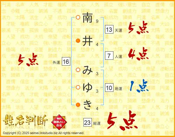 生活面を象徴する運勢です。外部から受ける影響力を表し、結婚運、家庭運や職場、環境への順応性を表します。総運から人運を引いた画数。姓や名が1文字の場合を除く。