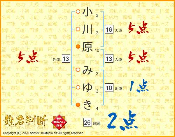 小川原みゆきさんの総運は26画の2点!