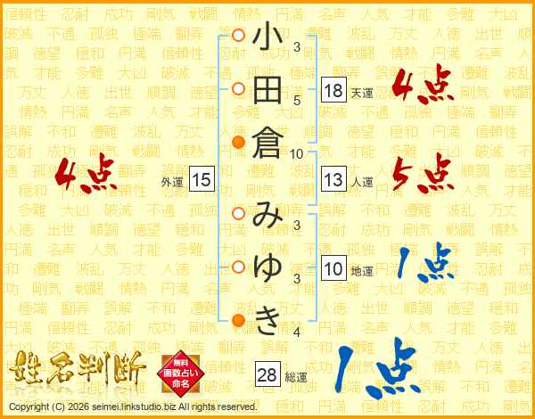 小(3画)田(5画)倉(10画) み(3画)ゆ(3画)き(4画)
