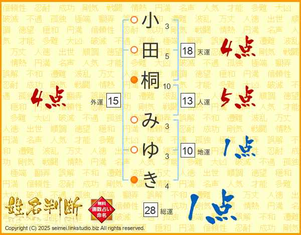 小(3画)田(5画)桐(10画) み(3画)ゆ(3画)き(4画)
