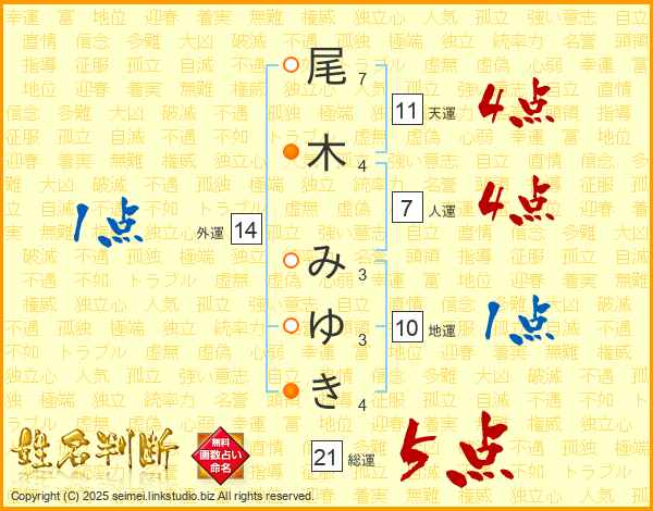 尾(7画)木(4画) み(3画)ゆ(3画)き(4画)