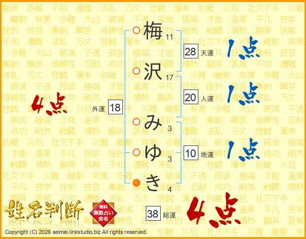 梅(11画)沢(17画) み(3画)ゆ(3画)き(4画)