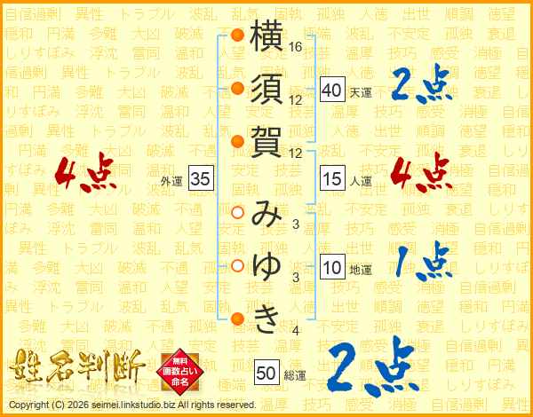 横須賀みゆきさんの総運は50画の2点!