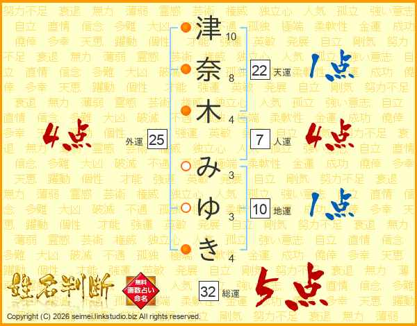 津(10画)奈(8画)木(4画) み(3画)ゆ(3画)き(4画)