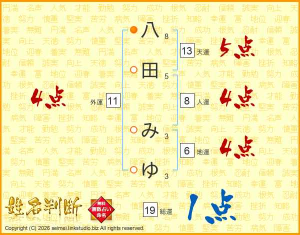 生活面を象徴する運勢です。外部から受ける影響力を表し、結婚運、家庭運や職場、環境への順応性を表します。総運から人運を引いた画数。姓や名が1文字の場合を除く。