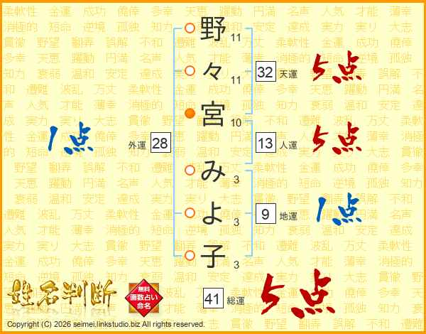 野(11画)々(11画)宮(10画) み(3画)よ(3画)子(3画)
