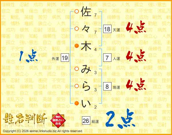 生活面を象徴する運勢です。外部から受ける影響力を表し、結婚運、家庭運や職場、環境への順応性を表します。総運から人運を引いた画数。姓や名が1文字の場合を除く。
