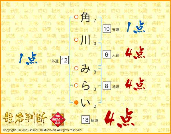 生活面を象徴する運勢です。外部から受ける影響力を表し、結婚運、家庭運や職場、環境への順応性を表します。総運から人運を引いた画数。姓や名が1文字の場合を除く。