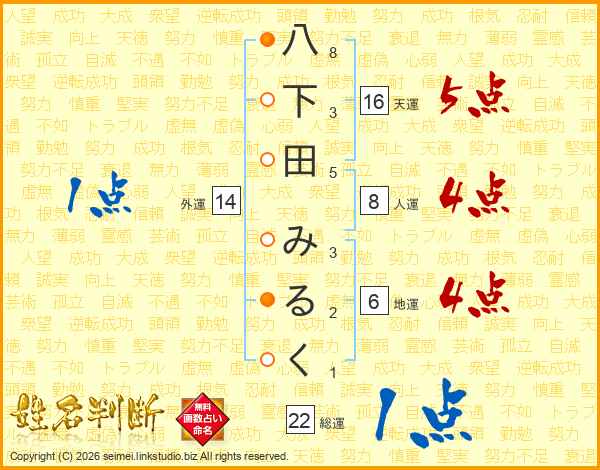生活面を象徴する運勢です。外部から受ける影響力を表し、結婚運、家庭運や職場、環境への順応性を表します。総運から人運を引いた画数。姓や名が1文字の場合を除く。