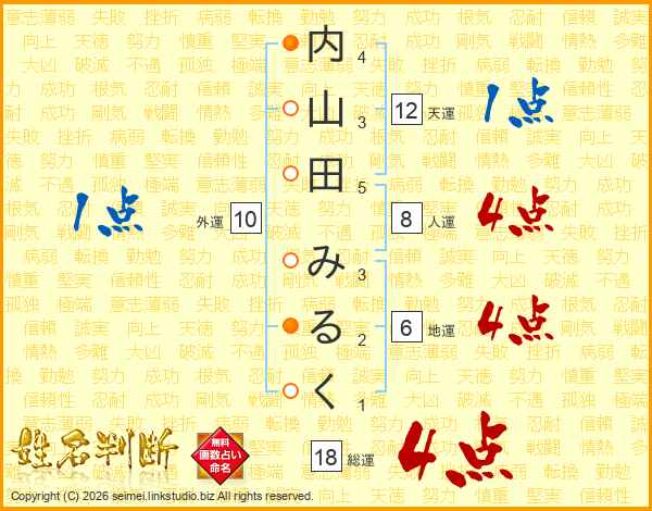生活面を象徴する運勢です。外部から受ける影響力を表し、結婚運、家庭運や職場、環境への順応性を表します。総運から人運を引いた画数。姓や名が1文字の場合を除く。