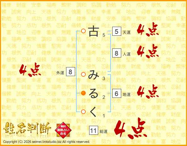 あなたの人生を表す1番重要な運勢です。生涯を通じて影響する総合運となり、主に50歳以降の晩年期に影響を及ぼします。苗字と名前の合計画数。