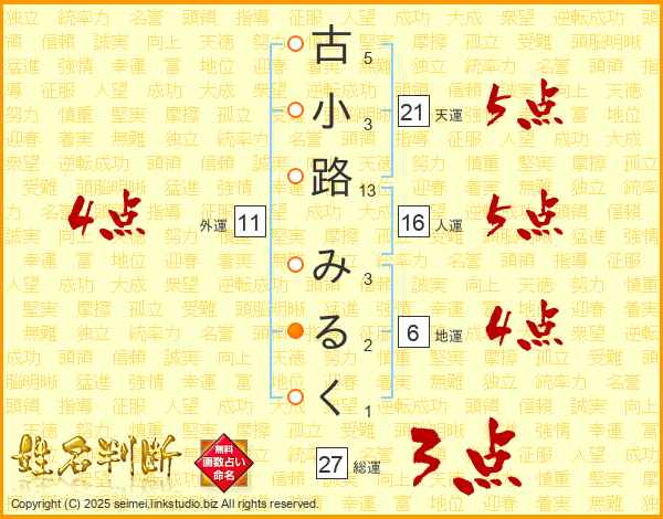 古(5画)小(3画)路(13画) み(3画)る(2画)く(1画)