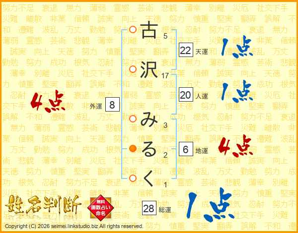 古(5画)沢(17画) み(3画)る(2画)く(1画)