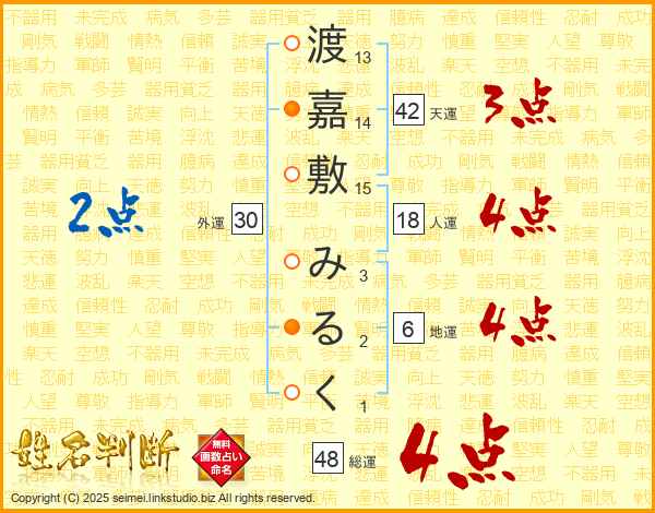 渡(13画)嘉(14画)敷(15画) み(3画)る(2画)く(1画)