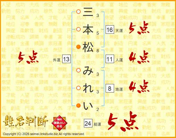 生活面を象徴する運勢です。外部から受ける影響力を表し、結婚運、家庭運や職場、環境への順応性を表します。総運から人運を引いた画数。姓や名が1文字の場合を除く。