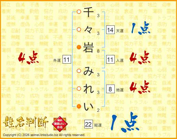 生活面を象徴する運勢です。外部から受ける影響力を表し、結婚運、家庭運や職場、環境への順応性を表します。総運から人運を引いた画数。姓や名が1文字の場合を除く。