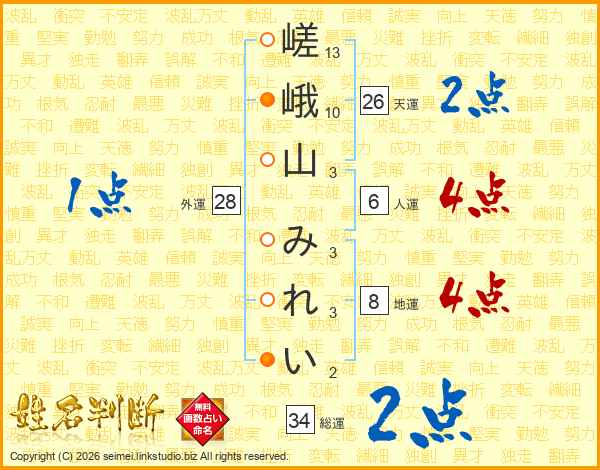 嵯峨山みれいさんの総運は34画の2点!