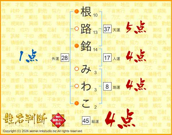 根(10画)路(13画)銘(14画) み(3画)わ(3画)こ(2画)