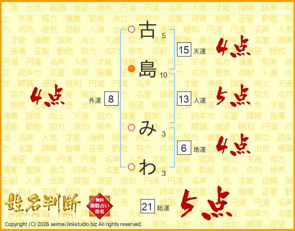 生活面を象徴する運勢です。外部から受ける影響力を表し、結婚運、家庭運や職場、環境への順応性を表します。総運から人運を引いた画数。姓や名が1文字の場合を除く。