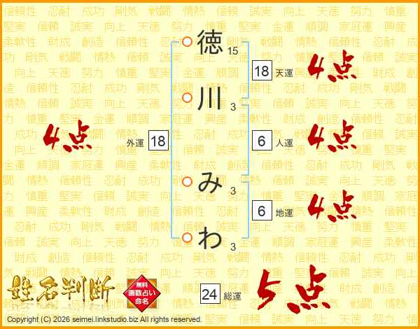 生活面を象徴する運勢です。外部から受ける影響力を表し、結婚運、家庭運や職場、環境への順応性を表します。総運から人運を引いた画数。姓や名が1文字の場合を除く。