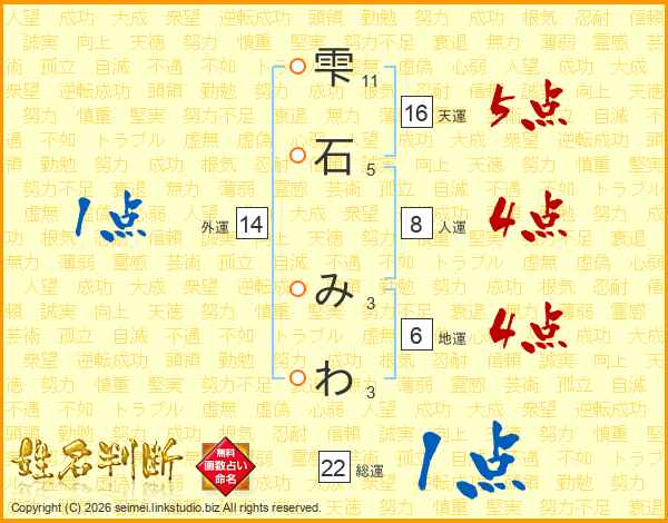 生活面を象徴する運勢です。外部から受ける影響力を表し、結婚運、家庭運や職場、環境への順応性を表します。総運から人運を引いた画数。姓や名が1文字の場合を除く。