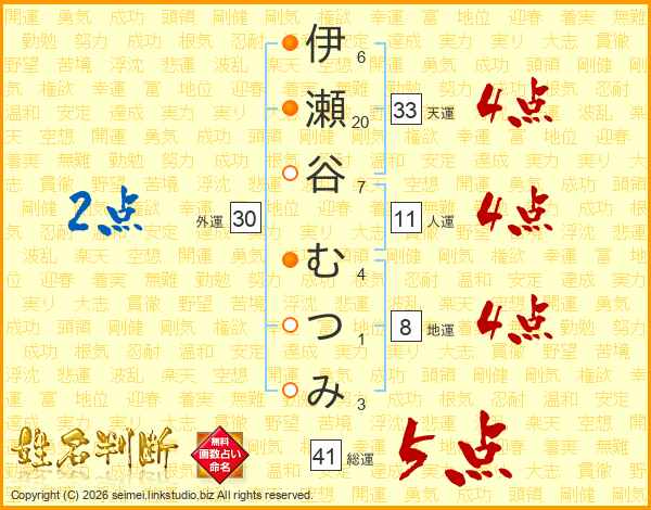 伊瀬谷むつみさんの総運は41画の5点!