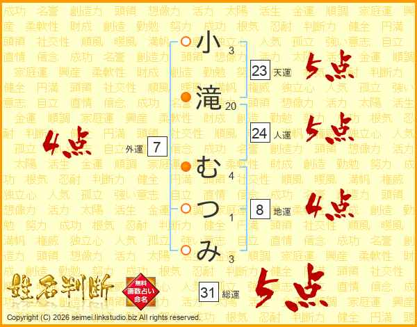 生活面を象徴する運勢です。外部から受ける影響力を表し、結婚運、家庭運や職場、環境への順応性を表します。総運から人運を引いた画数。姓や名が1文字の場合を除く。
