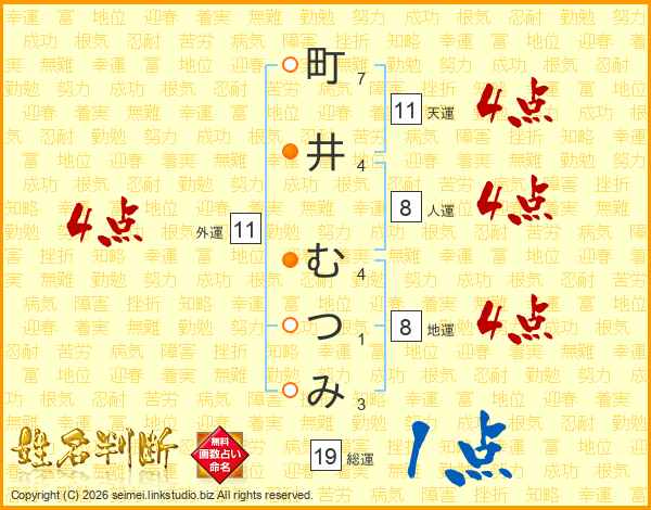 町(7画)井(4画) む(4画)つ(1画)み(3画)