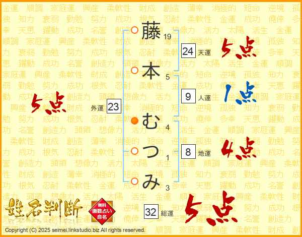 藤本むつみさんの総運は32画の5点!