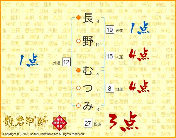 長(8画)野(11画) む(4画)つ(1画)み(3画)