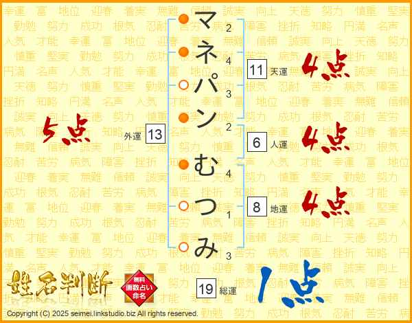 生活面を象徴する運勢です。外部から受ける影響力を表し、結婚運、家庭運や職場、環境への順応性を表します。総運から人運を引いた画数。姓や名が1文字の場合を除く。