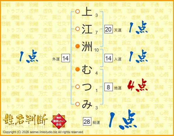 生活面を象徴する運勢です。外部から受ける影響力を表し、結婚運、家庭運や職場、環境への順応性を表します。総運から人運を引いた画数。姓や名が1文字の場合を除く。