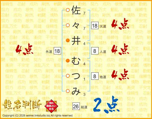 生活面を象徴する運勢です。外部から受ける影響力を表し、結婚運、家庭運や職場、環境への順応性を表します。総運から人運を引いた画数。姓や名が1文字の場合を除く。