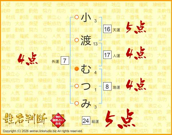 小(3画)渡(13画) む(4画)つ(1画)み(3画)