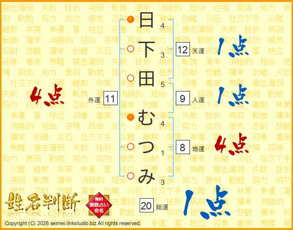 生活面を象徴する運勢です。外部から受ける影響力を表し、結婚運、家庭運や職場、環境への順応性を表します。総運から人運を引いた画数。姓や名が1文字の場合を除く。