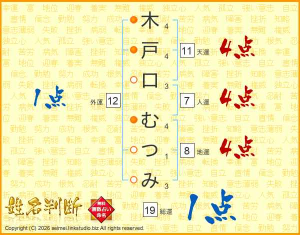 木(4画)戸(4画)口(3画) む(4画)つ(1画)み(3画)