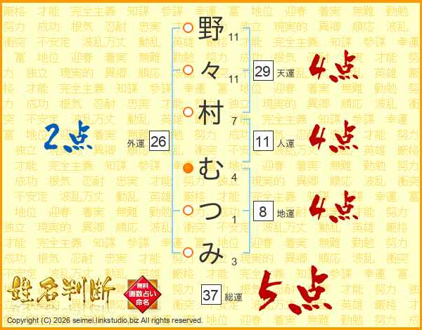 野々村むつみさんの総運は37画の5点!