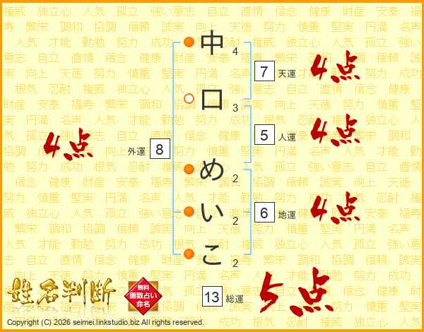 性格や才能などを表す2番目に重要な運勢です。人間関係や協調性、社会的な成功に影響します。主に20歳から50歳ぐらいまでの中年期の運勢を表します。苗字の下1文字と、名前の上1文字の合計画数。