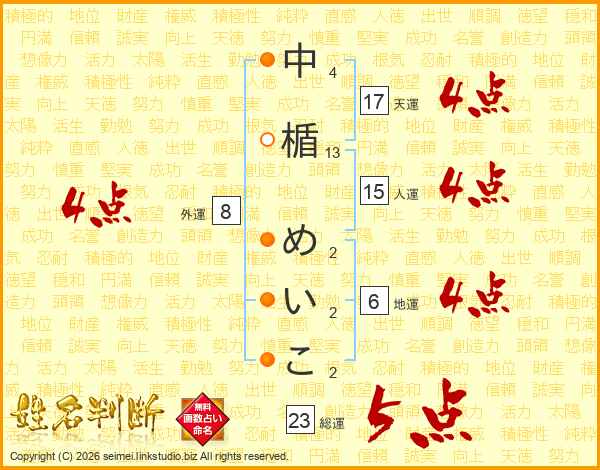 中楯めいこさんの総運は23画の5点!
