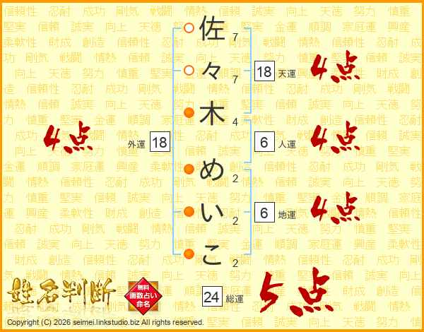 佐(7画)々(7画)木(4画) め(2画)い(2画)こ(2画)