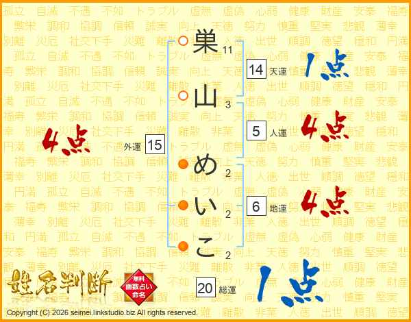 生活面を象徴する運勢です。外部から受ける影響力を表し、結婚運、家庭運や職場、環境への順応性を表します。総運から人運を引いた画数。姓や名が1文字の場合を除く。