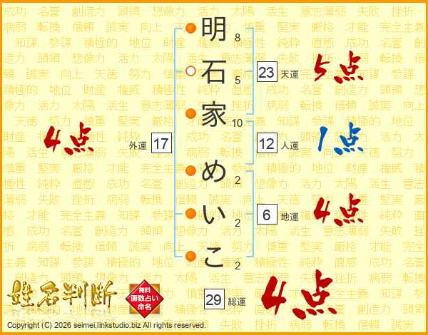 明石家めいこさんの総運は29画の4点!