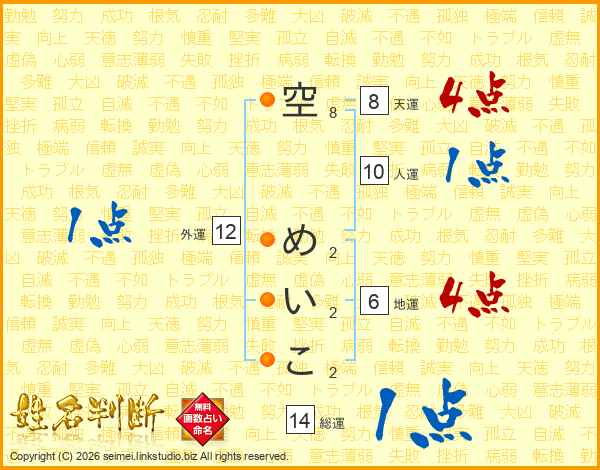 生活面を象徴する運勢です。外部から受ける影響力を表し、結婚運、家庭運や職場、環境への順応性を表します。総運から人運を引いた画数。姓や名が1文字の場合を除く。