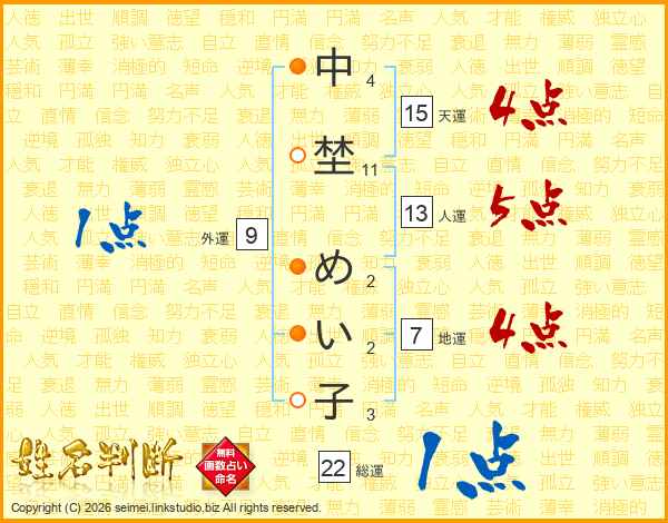 中(4画)埜(11画) め(2画)い(2画)子(3画)