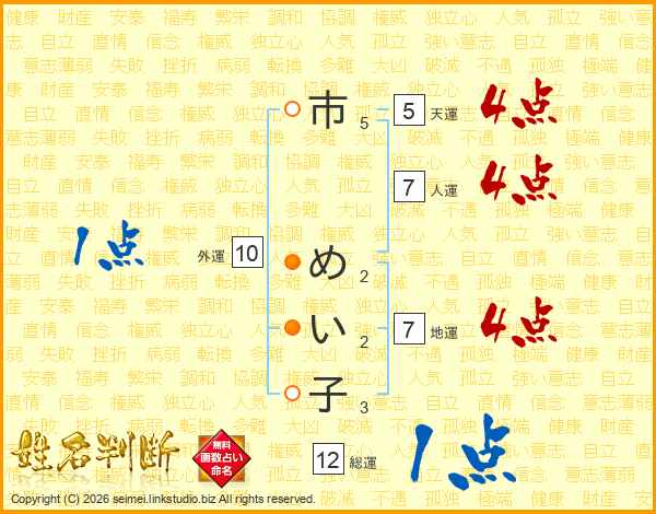 画数の奇数(○陽)と偶数(●陰)の配列で吉凶を占います。どちらかにかたよる名前は大凶名で避ける必要があります。画数の奇数偶数。