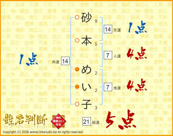 砂本めい子さんの総運は21画の5点!