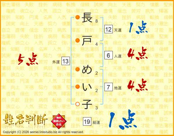 長(8画)戸(4画) め(2画)い(2画)子(3画)